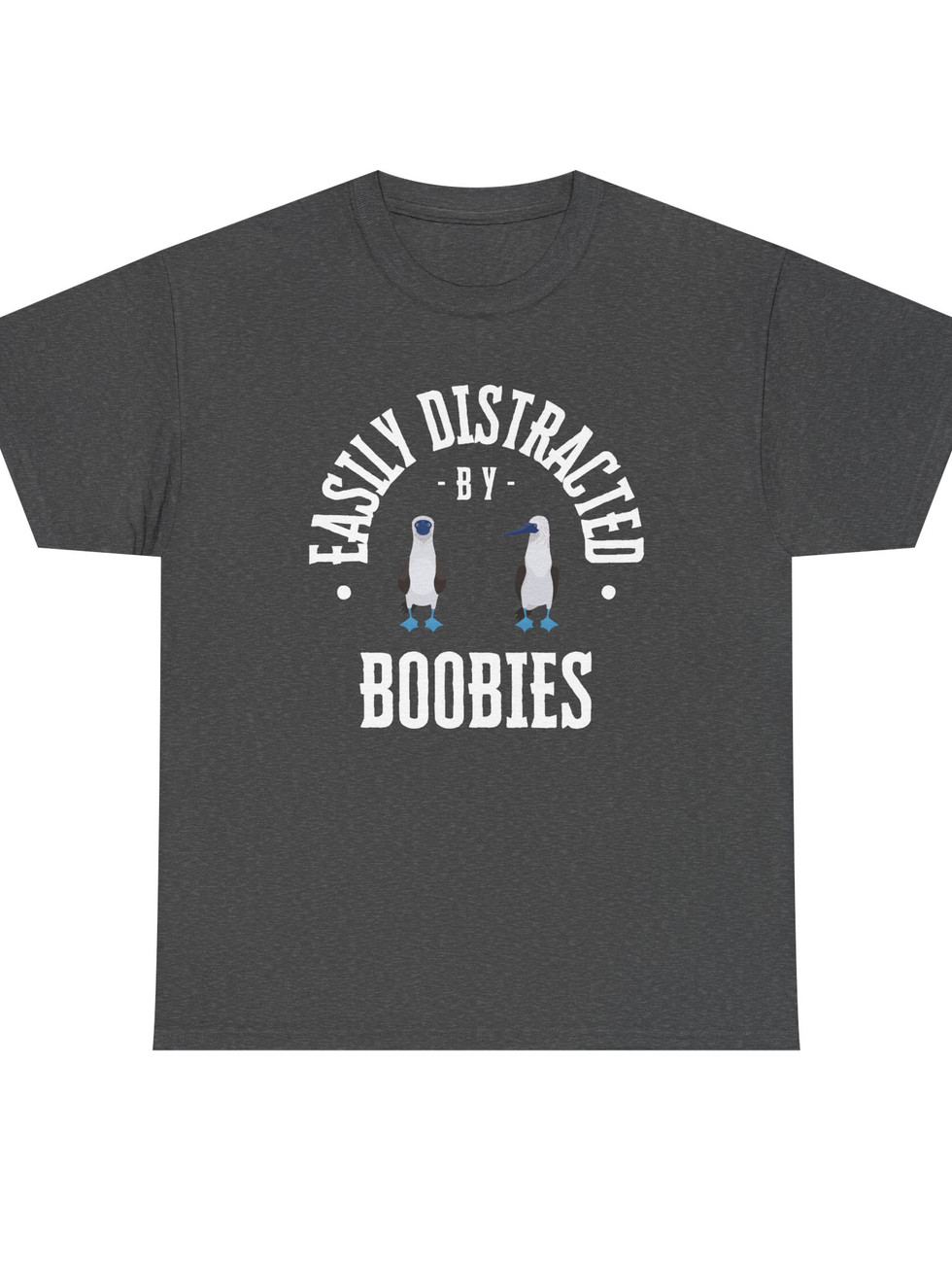 Big, bold text proudly confesses EASILY DISTRACTED BY BOOBIES across the chest, with a pair of cheeky blue-footed booby birds perched like they know exactly what's going on.