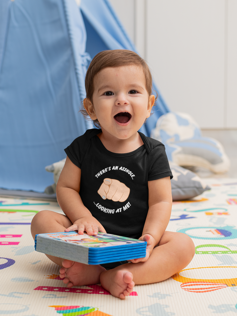Bold text THERE'S AN ASSHOLE LOOKING AT ME with a finger pointing at whoever is looking! The most accurate description of every infant’s daily existence.